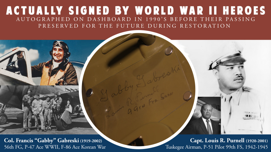 Previously owned by a collector and WWII enthusiast, this incredible Jeep was also signed by two famous WWII fighter pilots before their passing: Col. Francis "Gabby" Gabreski, a P-47 ace with the 56th Fighter Group, 61st Fighter Squadron and Capt. Louis Purnell, a Tuskegee Airmen who flew 88 missions with the 332nd Fighter Group, 99th Fighter Squadron.